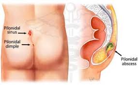A pilonidal sinus (PNS) is a small hole or tunnel in the skin. It may fill with fluid or pus, causing the formation of a cyst or abscess. It occurs in the cleft at the top of the buttocks. A pilonidal cyst usually contains hair, dirt, and debris. It can cause severe pain and can often become infected. If it becomes infected, it may ooze pus and blood and have a foul odor.